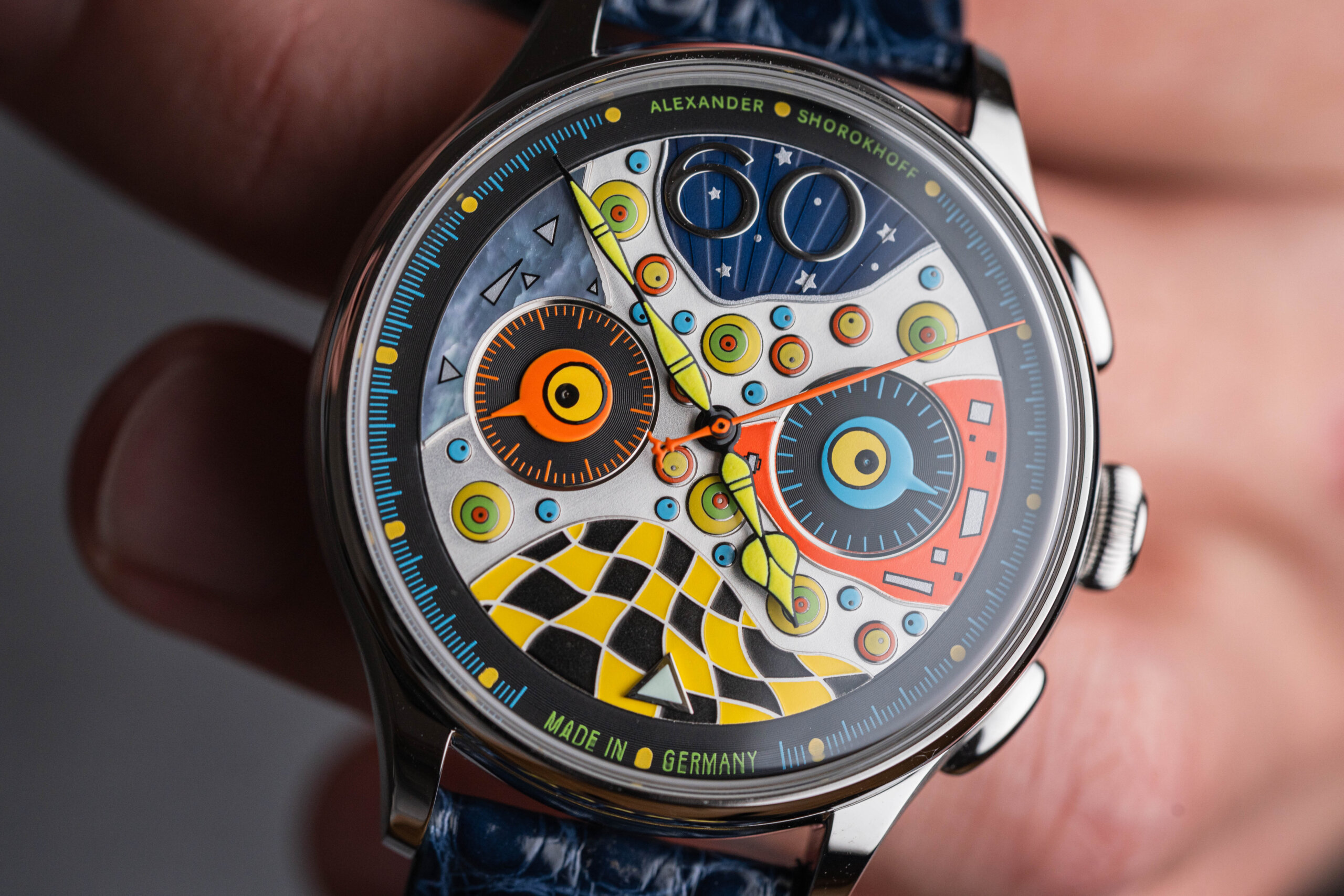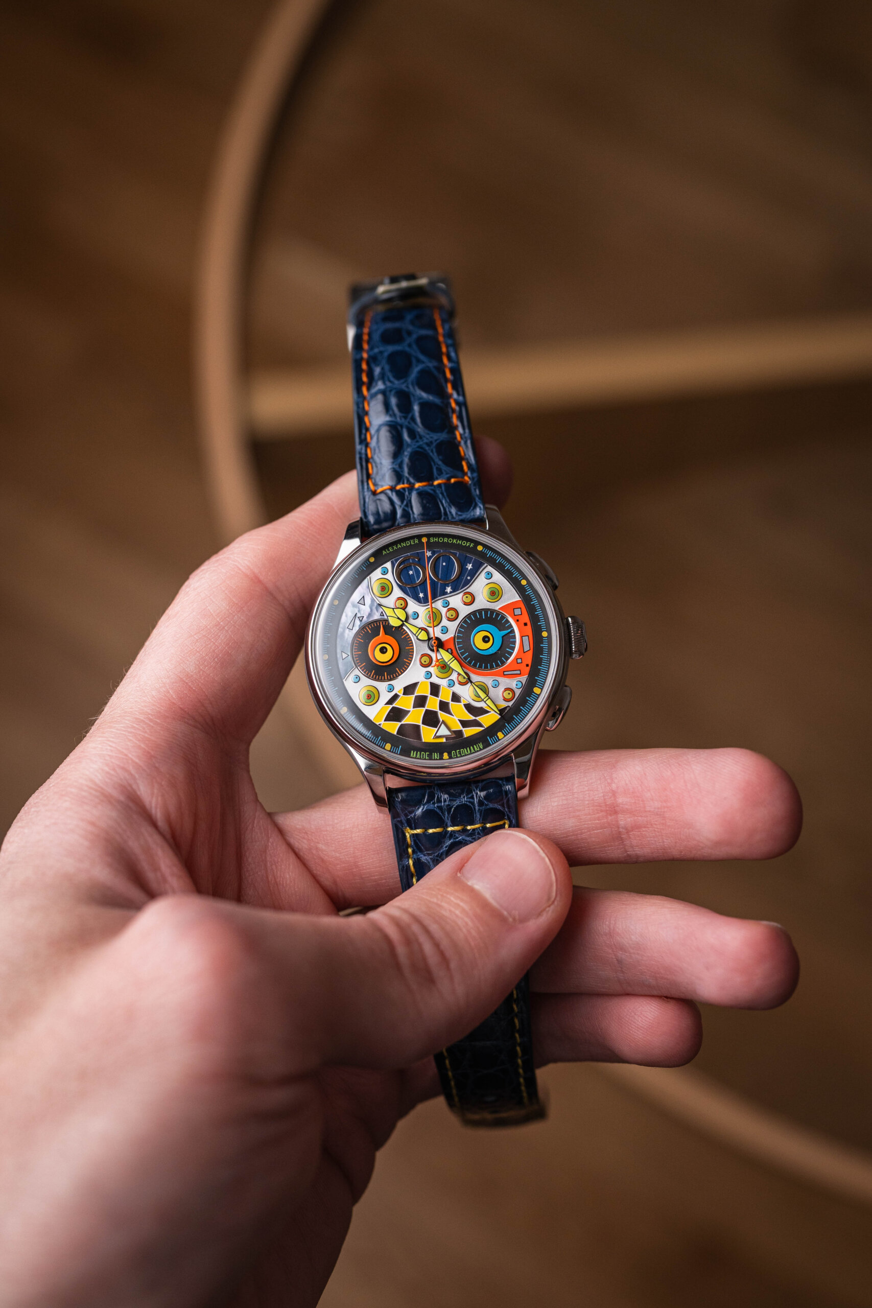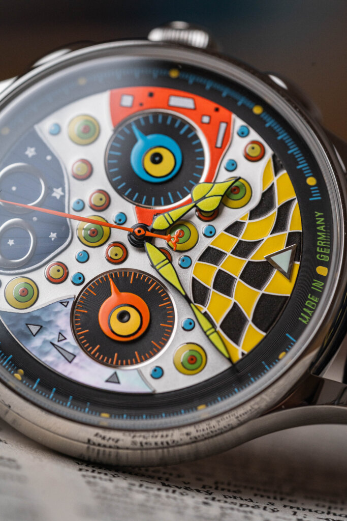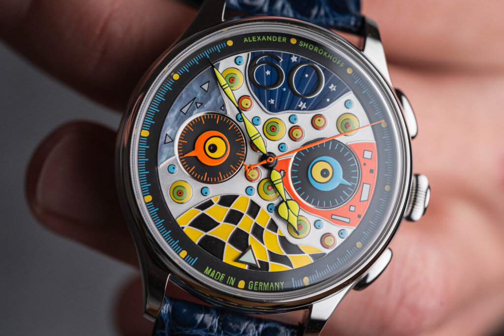 Na první pohled je jasné, že Shorokhoff se tady opravdu utrhl ze řetězu. Ciferník je sestavený z různě velkých ok – barevných cirkulárních segmentů, které připomínají kaleidoskop. Použité materiály jsou různorodé, od perleti přes mosaz po jemně strukturované vrstvy. Vzniká tak trojrozměrný efekt, který je živý, hravý a absolutně originální.