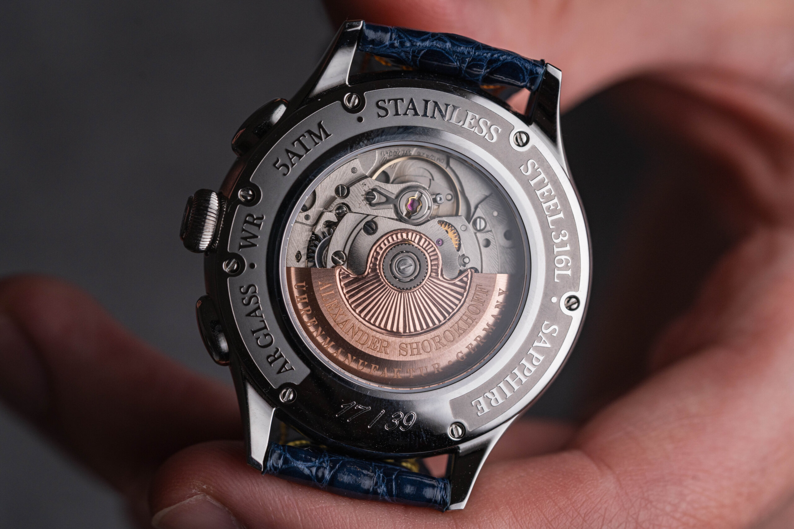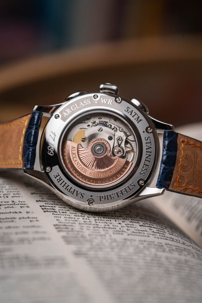 Uvnitř kreatury najdeme automatický chronografický strojek 2030.DD s rezervou chodu kolem 44 hodin. Není to žádná masová ETA, která se objevuje všude. Shorokhoff si dává záležet na zdobení i úpravách strojku a díky průhlednému dýnku to můžete ocenit i při odložení.
