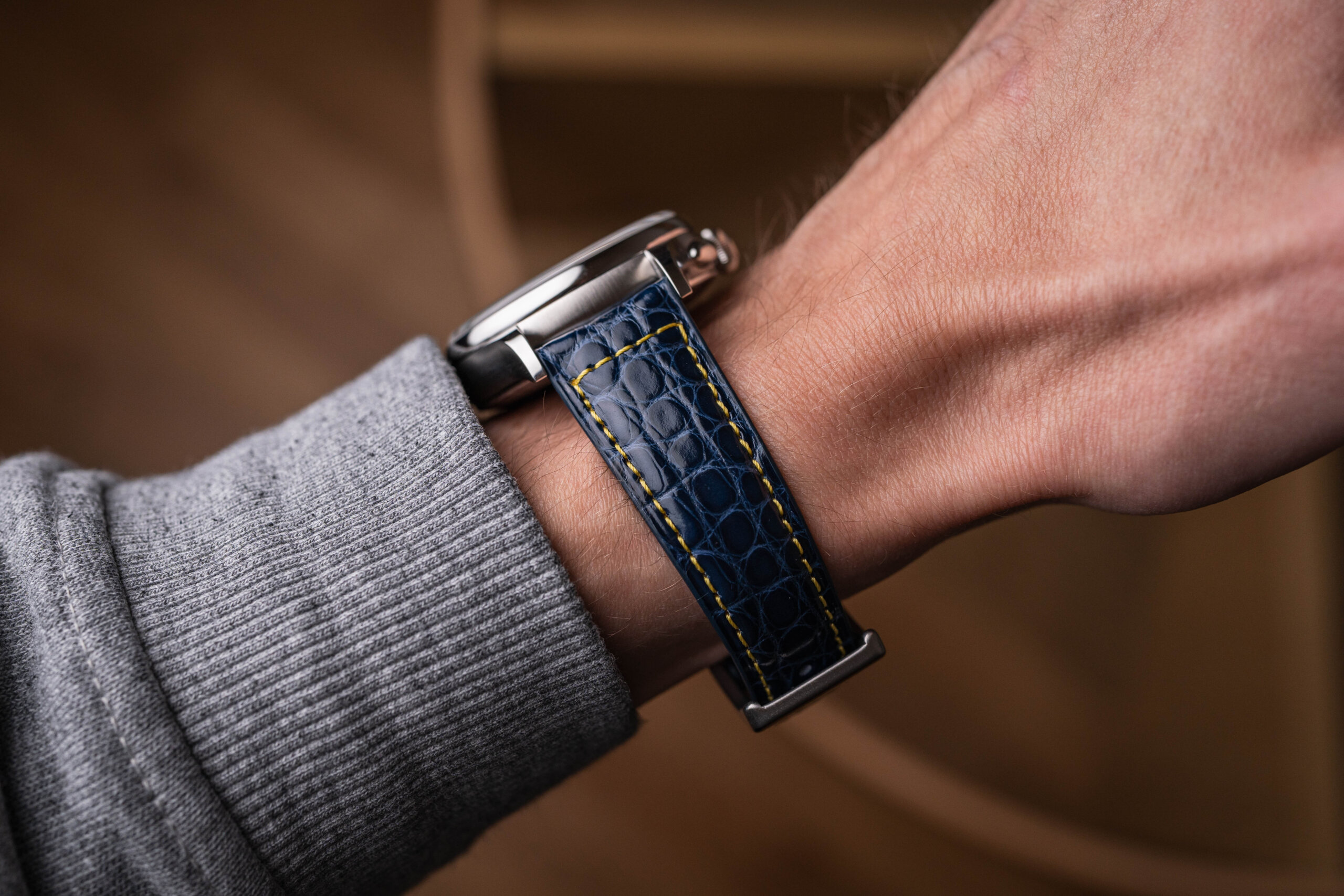 Jedinečný je i řemínek. Docela bych chtěl vidět toho modrého krokodýla, ze kterého je vyroben. Zde si výrobce vyhrazuje právo na změnu barvy řemínku, které jsou ručně šité, a může se stát, že kůže dané barvy je již nedostupná.