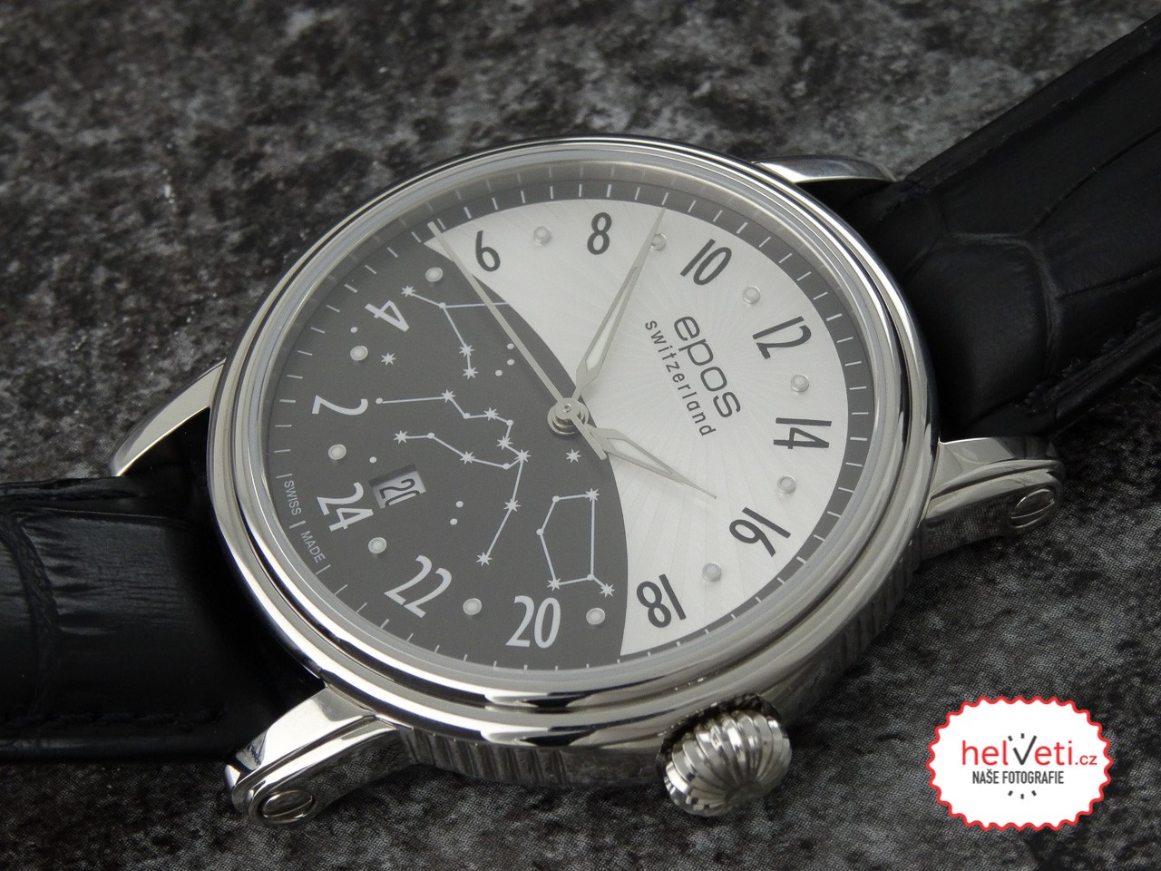 Nejvýraznější je číselník obloukovitě rozdělený na horní denní a spodní noční část. Ona denní je výrazně a přitažlivě gilošována slunečními paprsky jakoby vycházejícími z názvu Epos. Je to vskutku jako vycházející Slunce. Naopak černá hvězdná obloha s centrálním souhvězdím Vodnáře symbolizuje noční hodiny, běžně označované v rozmezí 18 hodina večerní až 6 hodina ranní. Zjevně z estetických důvodů výrobce časy trochu posunul, aby vytvořil skutečnou hvězdnou oblohu. Povedlo se.