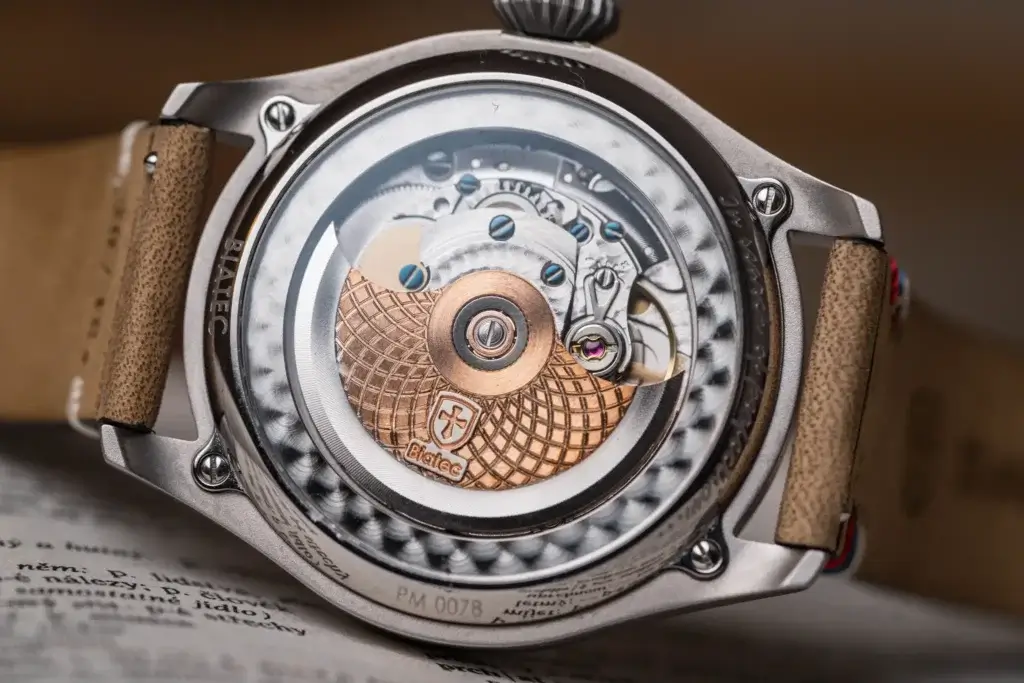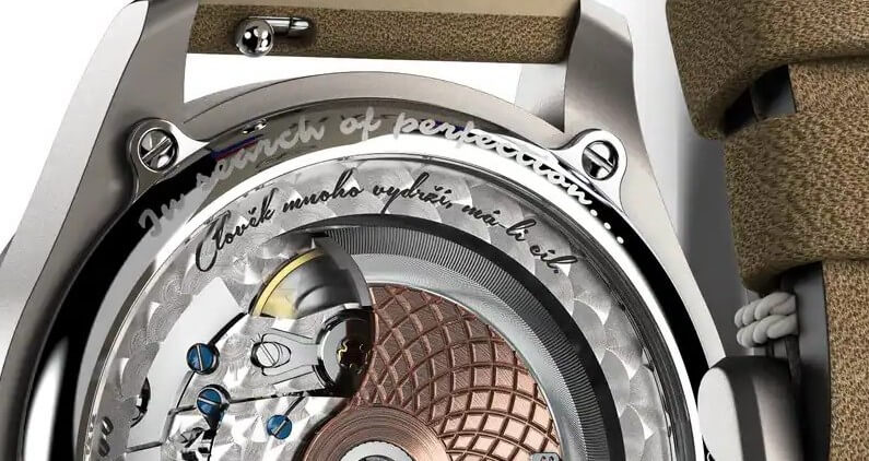 Samostatnou kapitolou by pak mohla být zadní strana pouzdra, kde se odehrává pokračování příběhu. Kromě průhledného dýnka, jež odhaluje pohled na pozoruhodnou práci kvalitního švýcarského strojku s automatickým nátahem Sellita SW200-1 Premium (Top) s 26 kameny je toho k vidění mnohem víc. Můžeme zde najít unikátní číslo konkrétního modelu, díky kterému jsou hodinky nejen doplňkem, ale i sběratelským artefaktem. Pohled však jednoznačně upoutá především gravura se slavným Masarykovým citátem „Člověk mnoho vydrží, má-li cíl“.