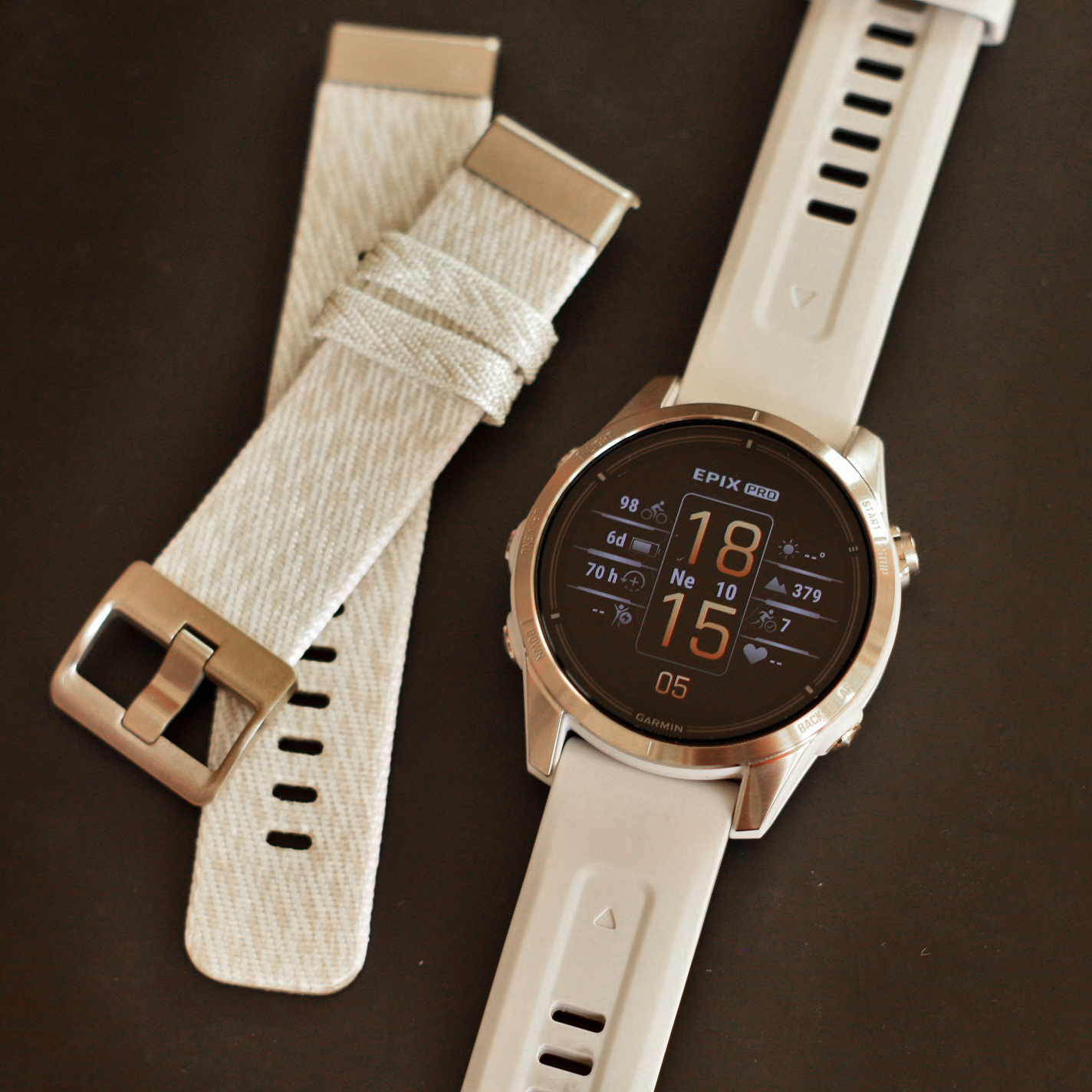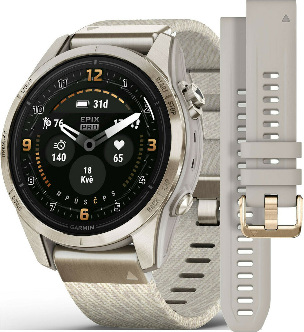 Zastoupení Garminu (tímto ještě jednou děkuji) jsem poprosila o možnost otestování modelu Garmin Epix Pro (Gen 2) ve velikosti 42 mm, ideálně v černé barvě. Černá je praktická, nebude na ní vidět špína. V Garminu se ale rozhodli, že k ženě se více hodí světlé provedení a překvapili mě modelem krémové barvy s jemně zlatými prvky Garmin Epix™ Pro (Gen 2) Sapphire Edition Soft Gold / Cream Heathered Nylon Band – 010-02802-20.