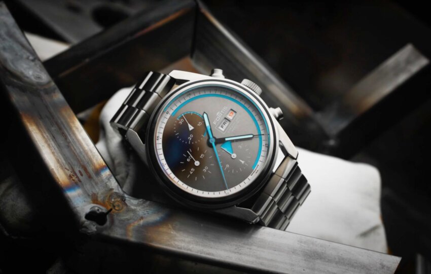 A něčím podobným – akorát na miniaturní škále, si prošel i každý titanový ciferník těchto hodinek. Všechny jsou totiž ručně ožehnuty plamenem, což na každém z nich vytváří unikátní barevný vzorek gradující od modré, přes fialovou a oranžovou až po měděnou barvu.