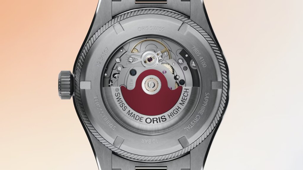 Uvnitř nám tiká kalibr Oris 733. V překladu: léty prověřená Sellita SW200 (založená na ETA 2824) s rudým rotorem. Nepřekvapí, ale ani neurazí. Nabízí 41hodinovou rezervu chodu, 4Hz frekvenci a samozřejmě například i hacking.