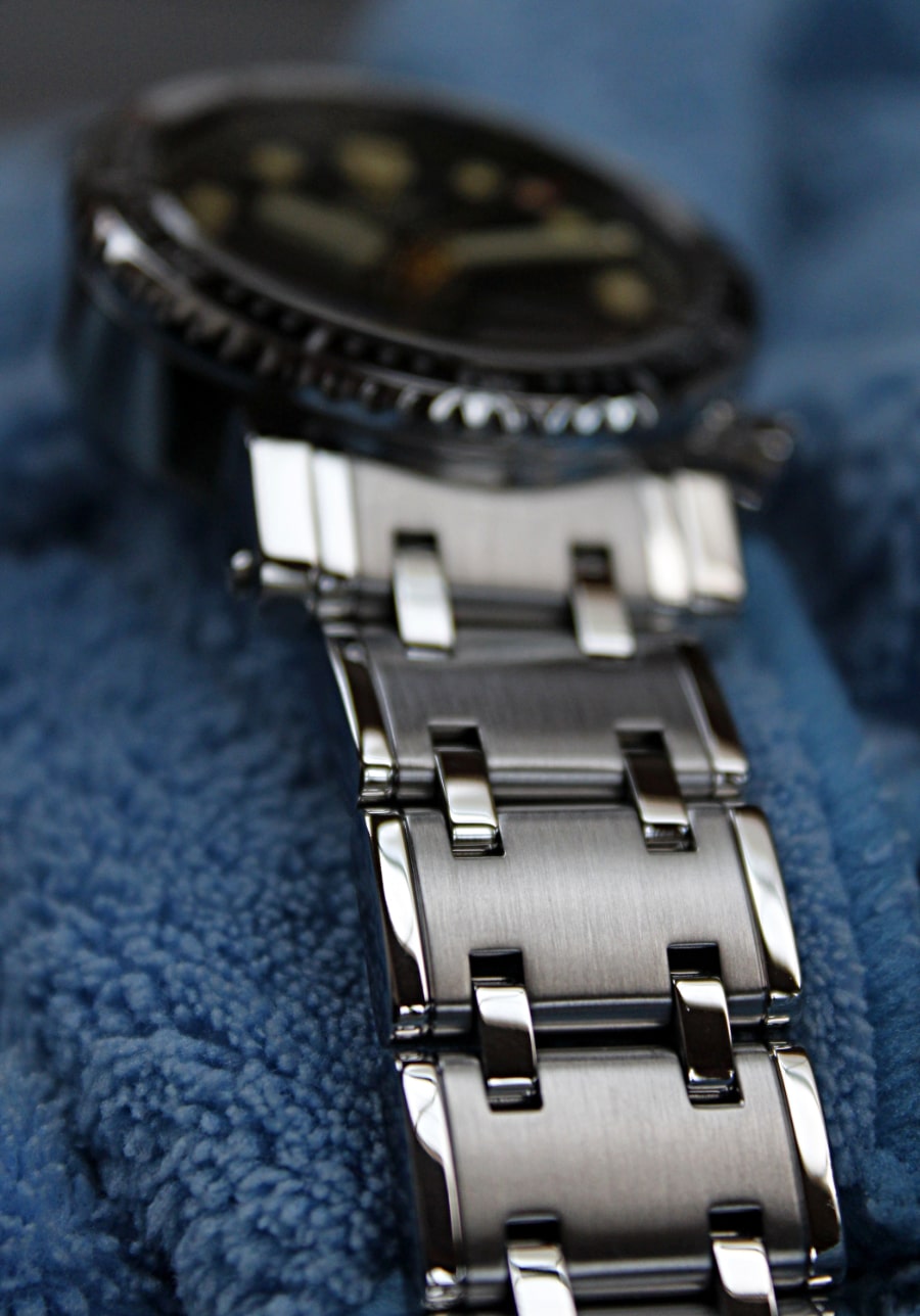 Významný podíl na vzhledu hodinek Leviathan má i náramek, nebo chcete-li kovový tah. Už samotné nožky pro jeho uchycení tvarově kopírují náramek a návaznost na pouzdro je bez nějakého plynulého přechodu. Tvar náramku je zajímavý a vše navíc ještě podtrhuje precizní povrchová úprava, která střídá vysoce leštěné a matně broušené plochy.