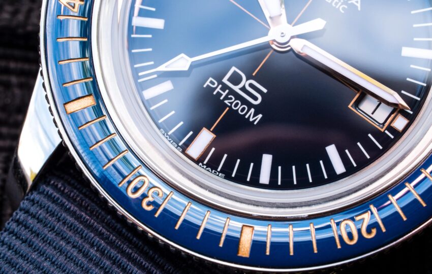 Nečekejme tady žádná překvapení. Temně modrá barva je doplněna bílými indexy. Navíc mají hlavní indexy na pozicích 3, 6, 9 a 12 zlaté orámování, které se pak protíná ve středu číselníku. Je to hezký, i když nijak nápadný detail. Na číselníku pak najdeme historické logo Certiny, název modelu DS PH200M a tradiční „Swiss made“, odkazující na výrobu přímo ve Švýcarsku.