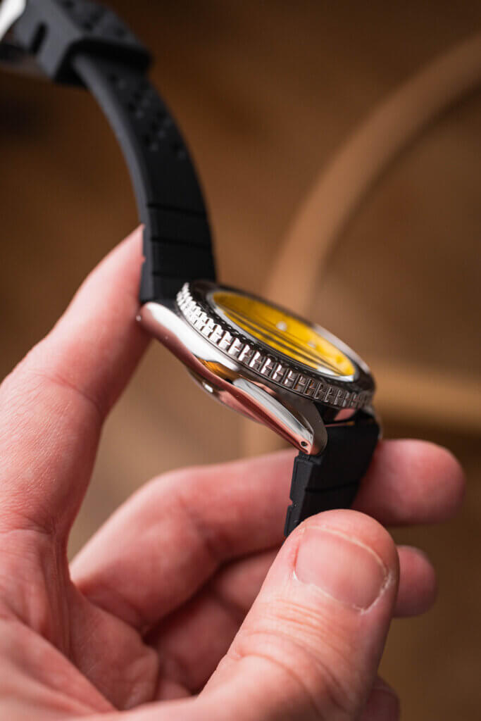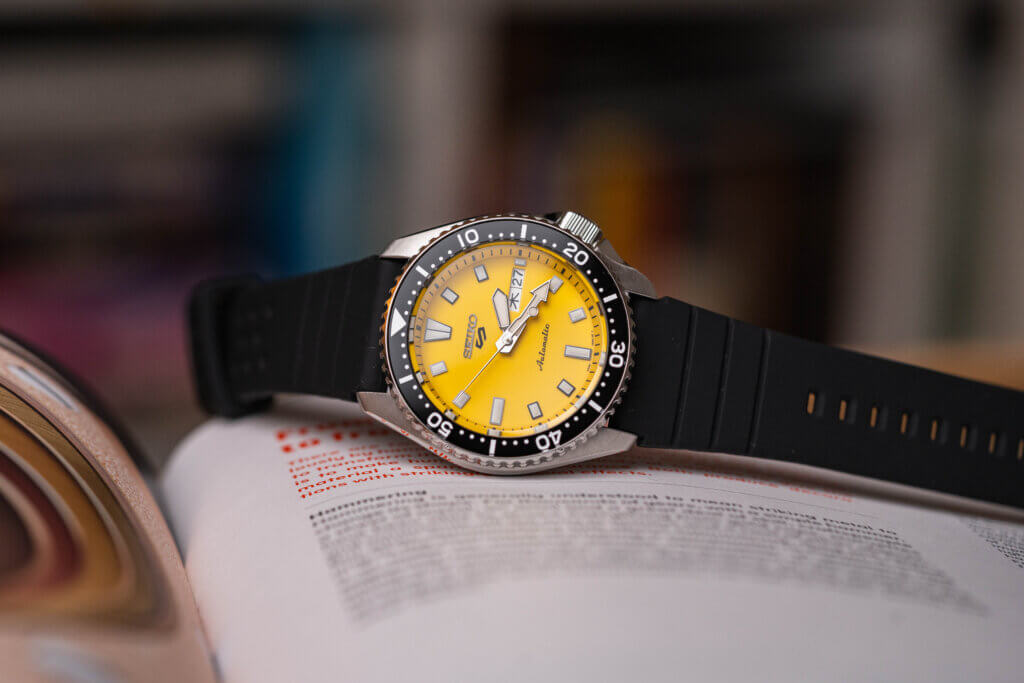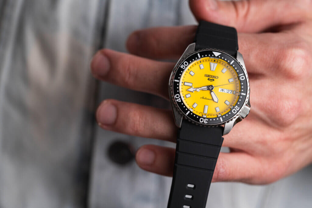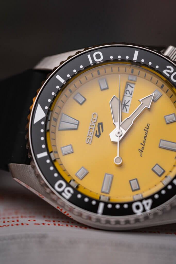 Nejvýraznějším prvkem hodinek je žlutý ciferník, který okamžitě přitahuje pozornost a dodává celému modelu energický výraz. V kontrastu s černou lunetou působí sportovně, přesto i elegantně. Hodinky si zachovávají charakteristické prvky SKX, jako jsou výrazné ručky a indexy s luminiscencí, jednosměrně otočná luneta nebo celkově robustní proporce 42,5 × 13,9 mm, které ale díky rozumné délce lug-to-lug 46 mm velmi dobře sedí i na průměrně velkém zápěstí. Silikonový řemínek zajišťuje pohodlí při nošení a zvyšuje odolnost při sportu či kontaktu s vodou.