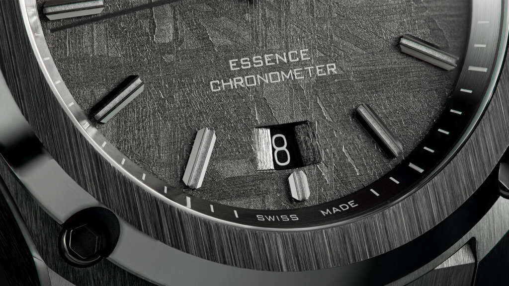 Švýcarská značka představila kolekci Essence Ceramica teprve v první půlce tohoto roku, a to se skeletonizovanými ciferníky. V září následovalo představení číselníků klasických – s horizontálním frézováním. A teď tu máme první Ceramica s číselníkem unikátním – z meteoritu.