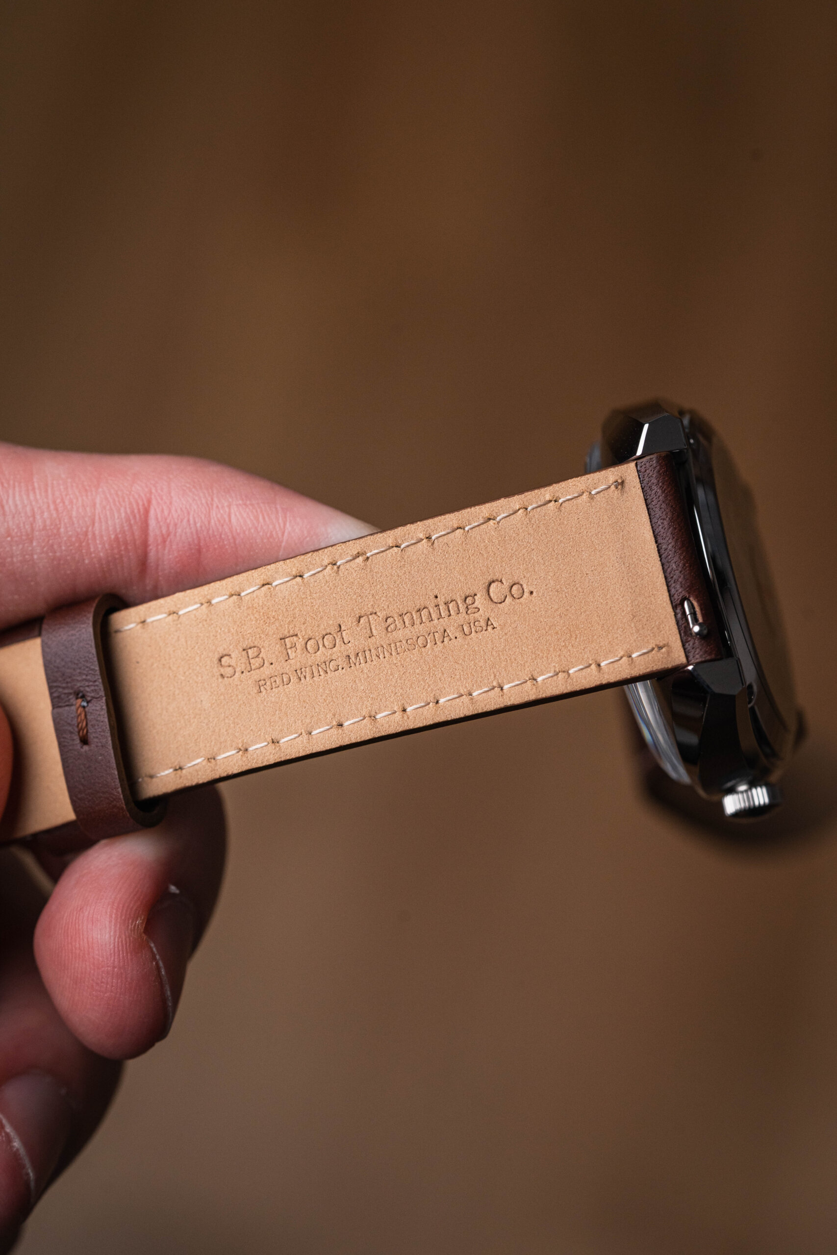 Na první pohled působí kožený řemínek nenápadně. Teprve při bližším pohledu ze zadní strany vyjde najevo jeho původ. Kůže pochází od S. B. Foot Tanning Company, která spadá pod Red Wing Shoes.