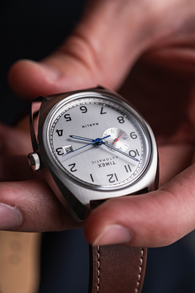 Až dosud sdílela kolekce Marlin kulaté pouzdro a jednoduchý tříručkový design. Timex Marlin Automatic Sub-Dial se od této tradice vědomě odklání. Přináší polštářkovité pouzdro, subciferník s 24hodinovou stupnicí a jemné barevné akcenty, které hodinkám dodávají ležérnější vintage charakter.