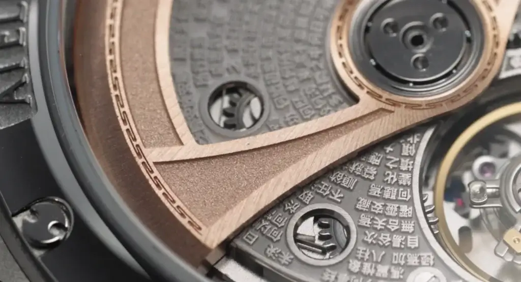 Atelier Wen si navíc pořádně vyhrál se vzhledem strojku. Rotor je tak pozlacený a – co především – hlavní ¾ destičku strojku pokrývá báseň od Qu Yuana. A ačkoliv my tedy ty čínské znaky přečíst nedokážeme, esteticky to na nás působí hezky…