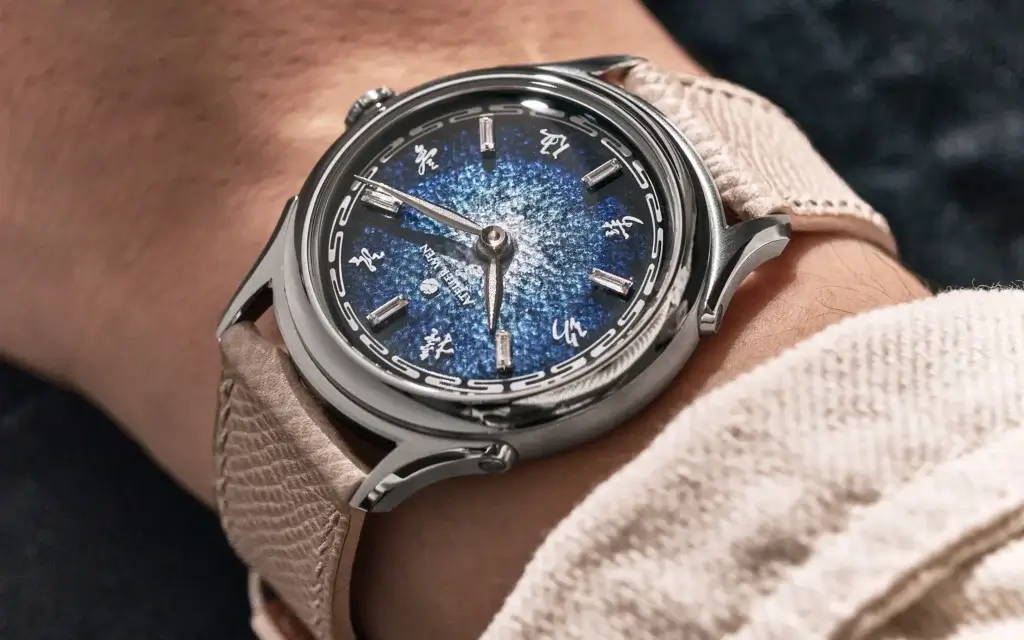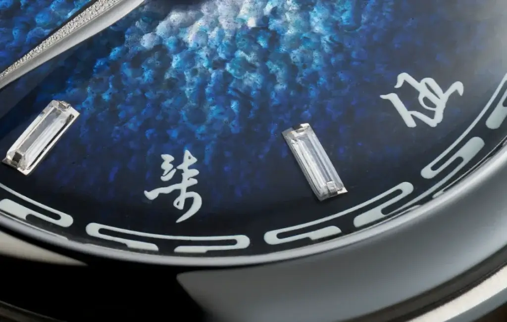 Odvážným krokem čínských designerů je zahrnutí vysokých indexů z baguette diamantů kombinovaných s kaligrafickými číslicemi (dostupná bude verze jak s čínskými znaky, tak i s arabskými číslicemi), které na úplném okraji obklopuje tradiční čínský vzor, který už jsme zmínili u korunky.