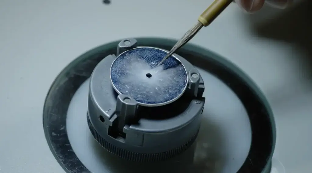 Pro Atelier Wen ale samotný smalt (s fumé gradientem!) pořád nebyl dostatečně dobrý. Ciferník je proto zároveň ručně obušený (technikou zvanou „hand-hammering“), což mu dodává nádhernou strukturu.